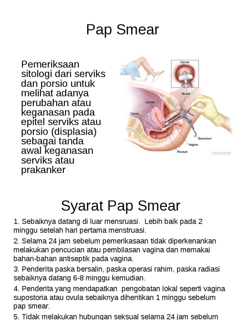 Pap smear adalah pemeriksaan yang dilakukan untuk deteksi dini kanker serviks atau kanker leher rahim. Ramai wanita yang takut untuk melakukan pemeriksaan pap smear kerana ia dianggap sesuatu yang menyakitkan vagina, sekaligus menimbulkan rasa kurang selesa. Sebelum pemeriksaan, pastikan bahwa anda dalam keadaan tidak menstruasi. Pap smear alias pap test yaitu metode pemeriksaan yang dilakukan guna mendeteksi ada atau tidaknya kanker leher rahim atau kanker serviks. Pemeriksaan pap smear adalah salah satu metode pemeriksaan skrining kanker serviks yaitu dengan pengambilan apusan sel epitel serviks yang akan diperiksa.memakai mikroskop untuk. Pap smear adalah pemeriksaan mikroskopis terhadap sel leher rahim untuk mendeteksi perubahan akibat infeksi virus hpv tipe 16 dan 18. Bagi anda yang ingin melakukan tes pap smear, sebaiknya perhatikan 3 syarat pemeriksaan pap smear berikut ini agar tidak 3 syarat pemeriksaan pap smear. Perbedaan mendasar pap smear dan iva terletak pada prinsip dan akurasi pemeriksaan. Cara pemeriksaan pap smear 1. Pemeriksaan pap smear dapat dihentikan jika sudah berusia diatas 65 tahun ditambah tidak adanya riwayat sel serviks yang abnormal , dan hasil pap smear menunjukkan hasil negatif selama 3 kali. Saat dilakukan pap smear maka akan dilakukan pemeriksaan panggul gienekologis. Papanicalaou untuk penapisan awal dari gejala kanker leher rahim. Pap smear adalah pemeriksaan skrining untuk mendeteksi adanya kanker leher rahim atau kanker servik.